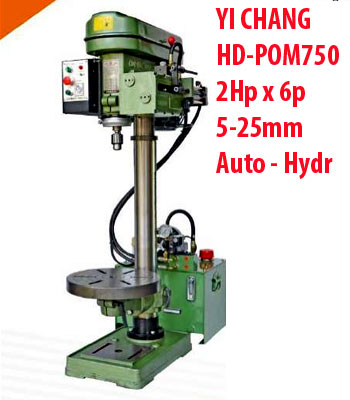 Máy khoan tự động thủy lực 5-25mm HD-POM750 Horng Dar Yi Chang Đài Loan được trang bị loại Motor 6 cực tốc độ chậm, cho phép chia hành trình khoan ra nhiều giai đoạn, thoát phôi (ba-dớ) tốt giúp lỗ khoan có độ chính xác cao hơn các loại khoan bàn thông thường.