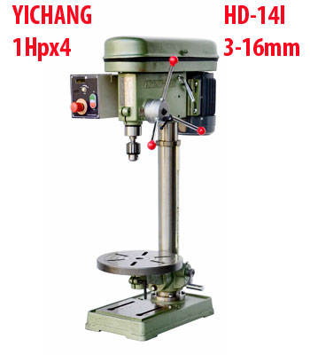 Máy khoan bàn 16mm Yi Chang HD-14I Đài Loan thiết kế kiểu thấp 1070mm, bàn khoan loại tròn đường kính 320mm, hành trình khoan 100mm, điểm đặc biệt của model HD-14I so với HD-14 là điều chình tốc độ khoan vô cấp kiểu núm vặn (xoay).