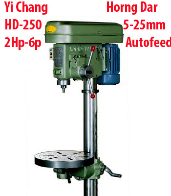 Máy khoan đứng 2Hp 25mm kiểu Autofeed HD-250 Yi Chang Đài Loan là loại khoan bàn có 2 chức năng khoan là khoan Manual (dùng tay kéo cần khoan) và chức năng khoan Auto Feed ( không cần dùng tay kéo) trục chính tự động khoan nhờ bộ ly hợp.