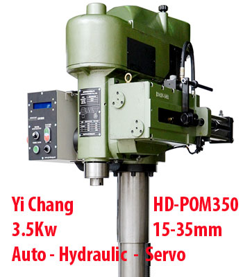 Máy khoan đứng Servo 15-35mm HD-POM350 Yi Chang Đài Loan thiết kế hành trình khoan 150mm, lỗ côn trục chính MT4, dùng được các loại đuôi côn MT4-JT6, MT4-B18, MT4-JT3, MT4-JT4 và mũi khoan đuôi côn MT2, MT3, MT4.