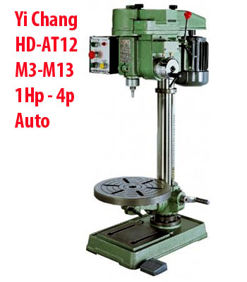 Máy ta rô tự động 1Hp M3-M13 HD-AT12 (Horng Dar) Yi Chang Đài Loan, thiết kế kiểu đứng, hành trình 93mm, lỗ côn trục chính MT2, cho phép sử dụng các loại đầu cặp mũi ta rô kiểu cố định YL-1/2, YL-3/4 và các loại chuôi cán MT2-SF, MT2-WF