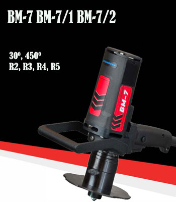 Máy vát góc BM-7 cho phép thực hiện vát góc 450 và 300 và vát các cung R2, R3, R4, R5. Trong đó theo tiêu chuẩn kèm theo máy là đài dao 450 (không bao gồm lưỡi cắt). Các loại đài dao 300, đài dao R là phụ kiện tùy chọn (Option).